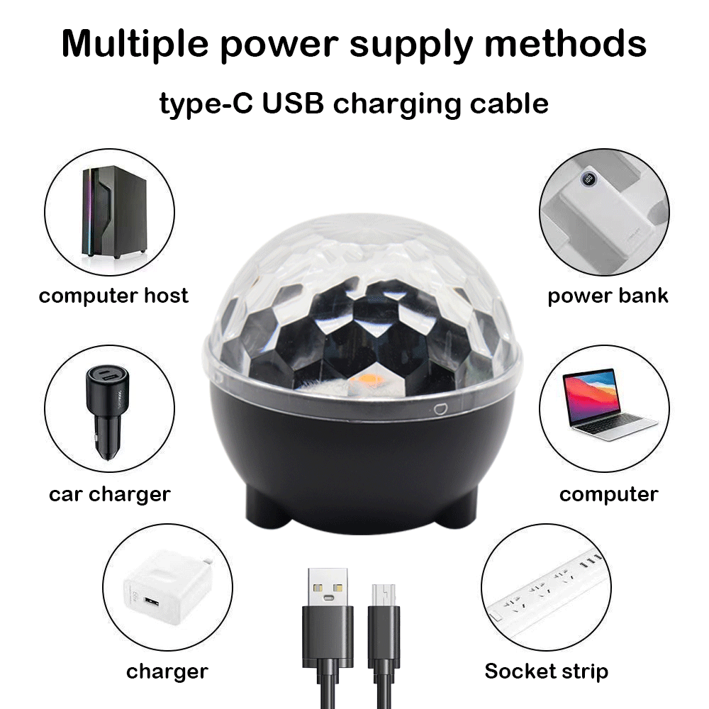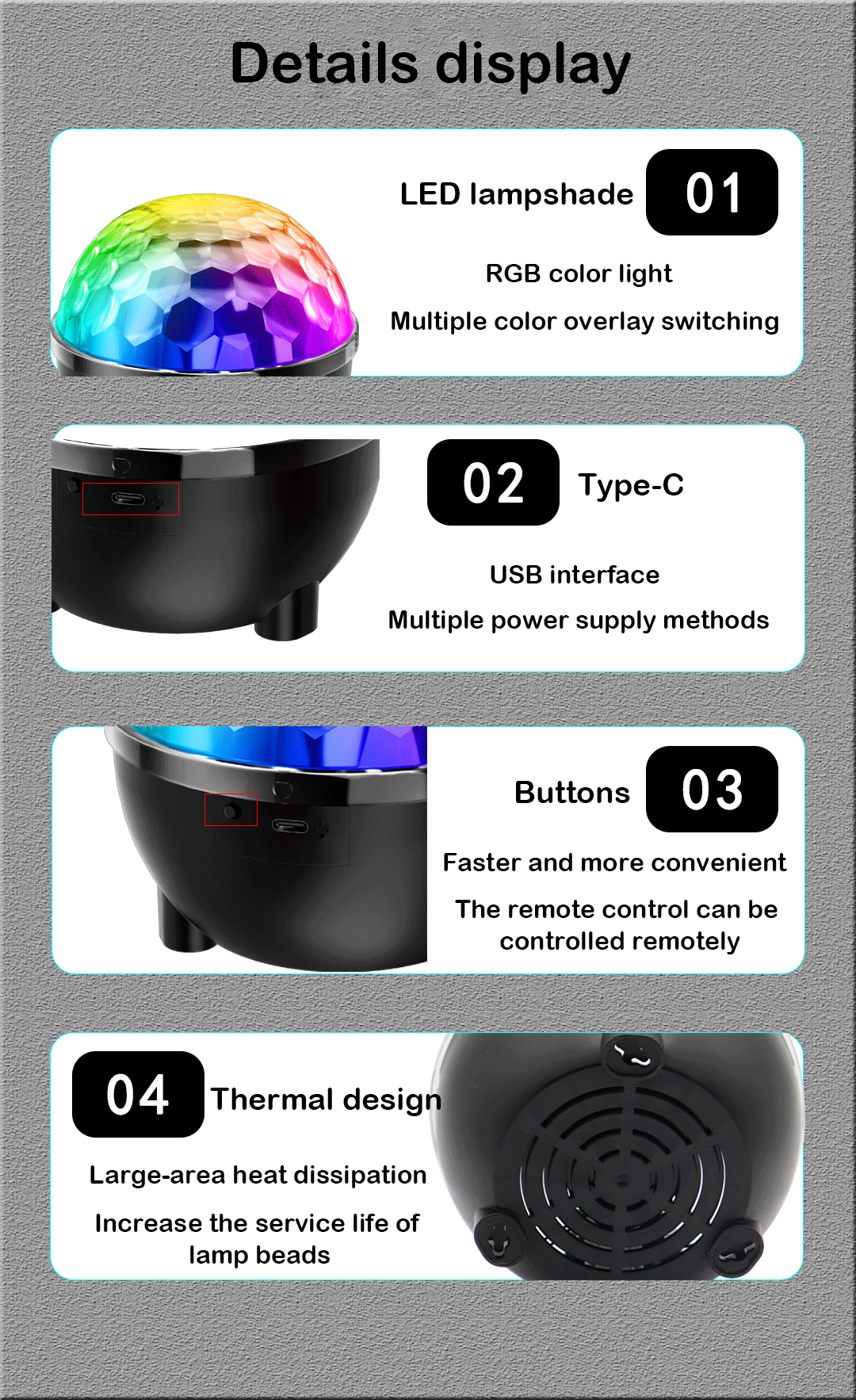 The new medium disco light features a high-quality PP material shell (Bottom base)+PS(lampshade), low-power YPW(yellow, pink, white) three color beads or RGBYPW (red, green, blue, yellow, pink, white) 6 colors, and a Type-C interface for easy use. Its size is 12*11cm, which does not take up space. Its lighting area is larger than normal 3 color disco ball. It is suitable for parties, disco, KTV and so on.